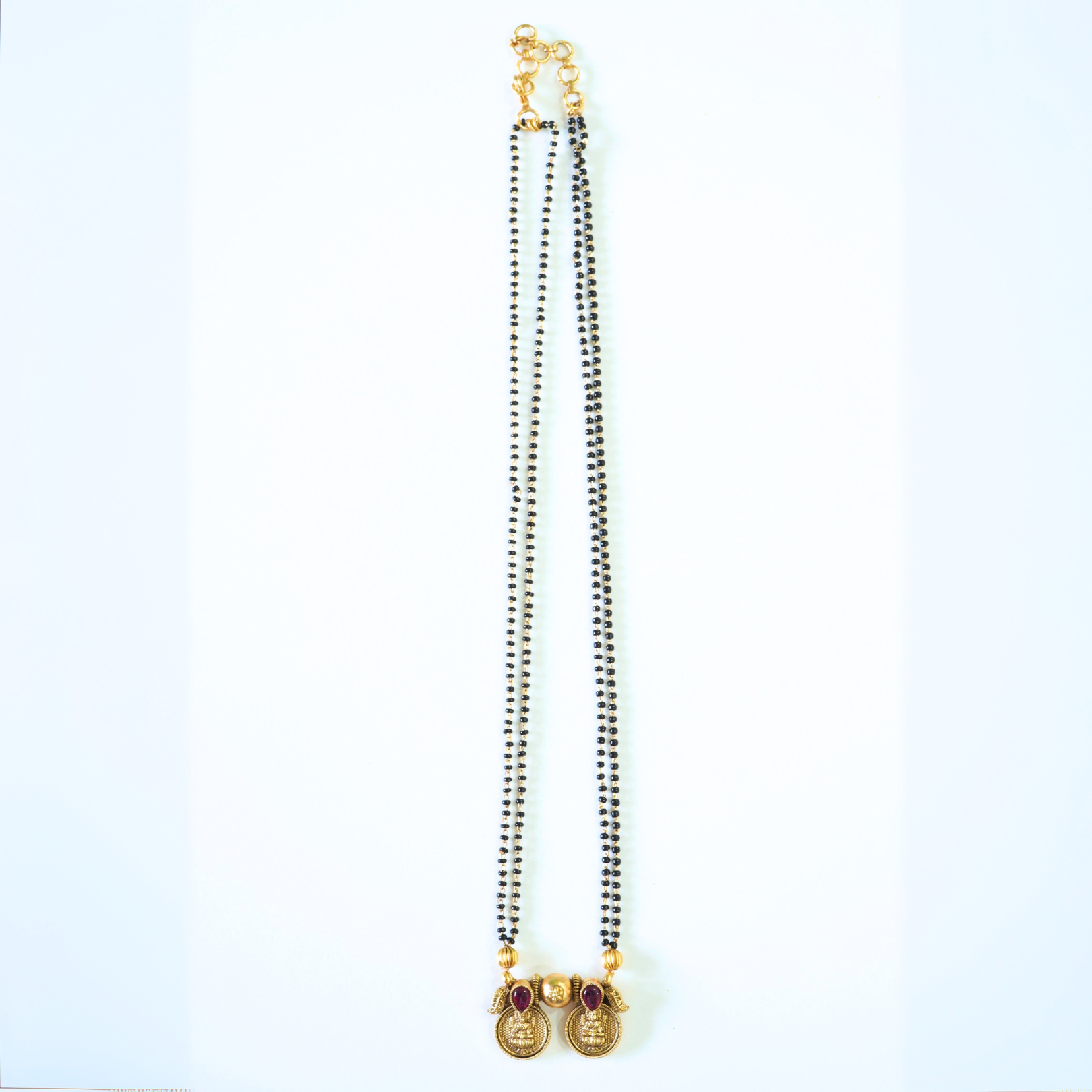 This antique gold-finish Lakshmi mangalsutra set is crafted from brass alloy with matte gold plating and ruby stones. Featuring a hook-lock necklace and push-back earrings, this traditional piece symbolizes prosperity and good fortune. Comes with matching earrings. Free shipping, even on COD.