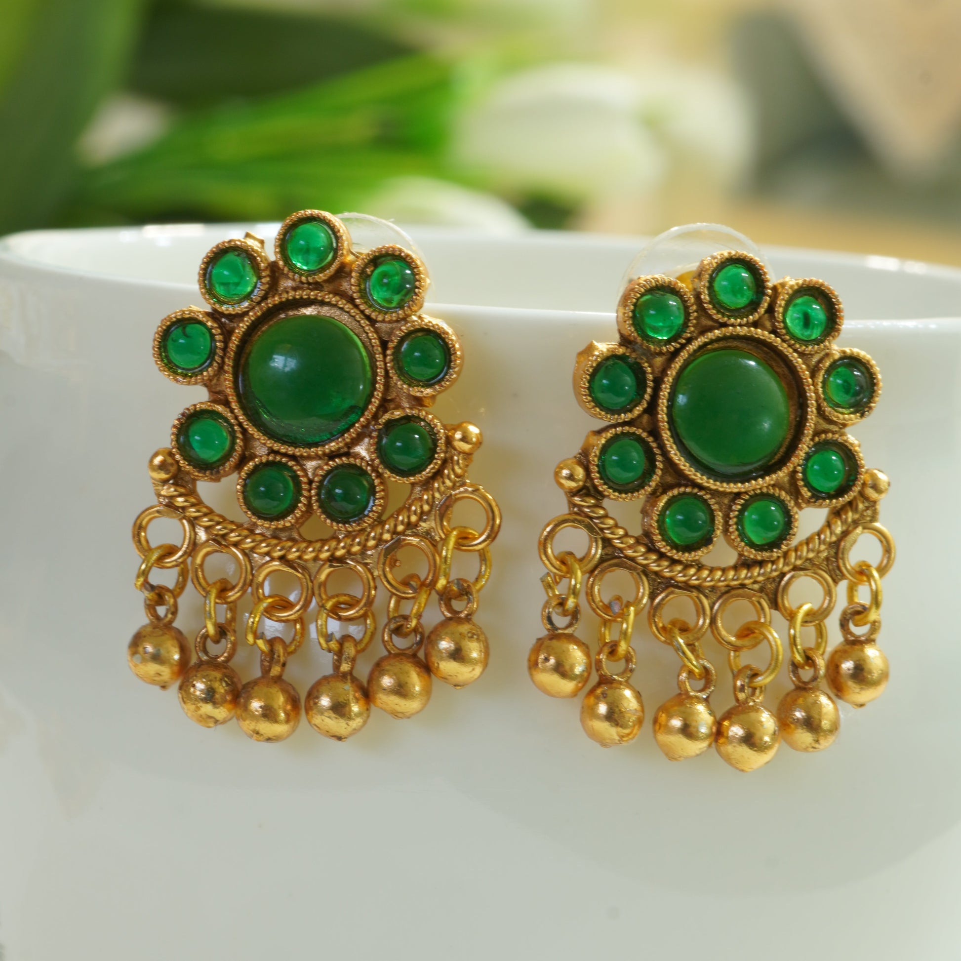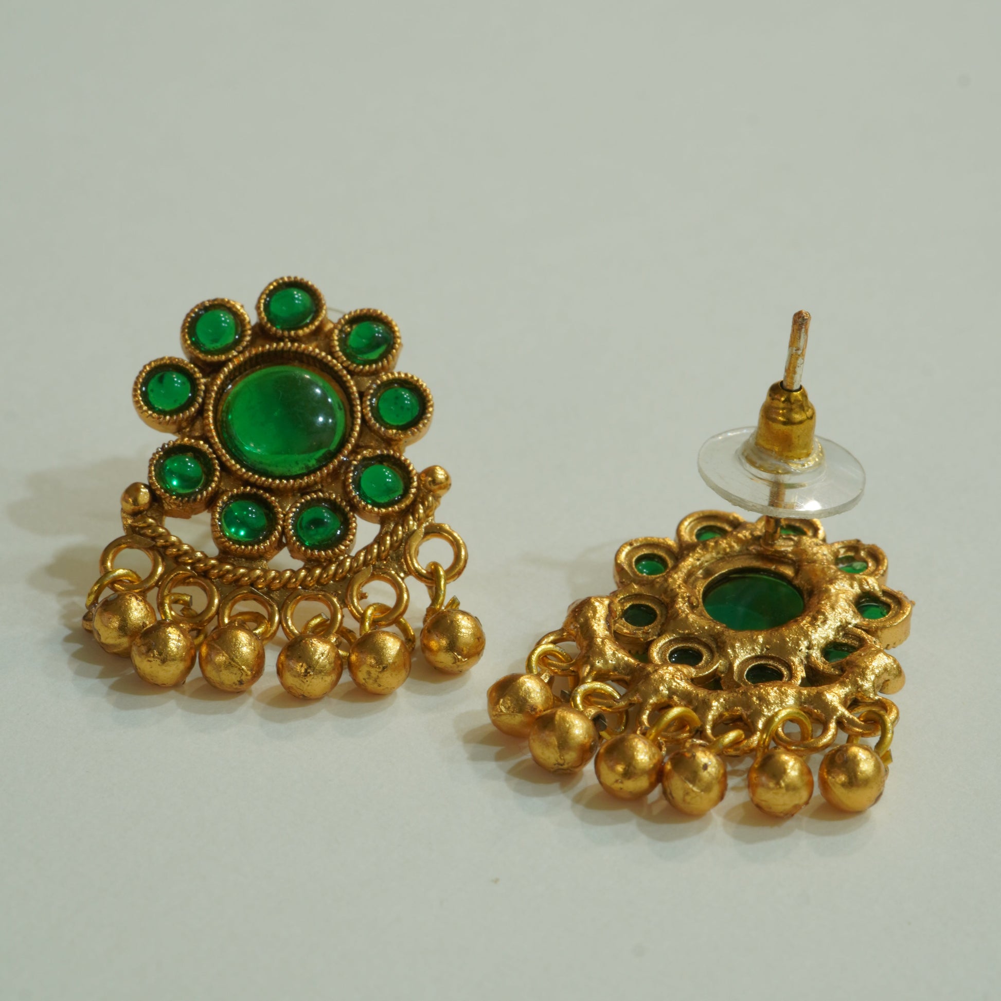 This elegant leafy-pattern necklace set, adorned with green kemp stones, is crafted from high-quality brass alloy with a matte gold finish. Paired with matching stud earrings, it radiates timeless charm and sophistication.