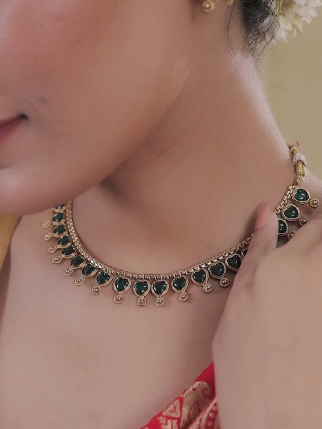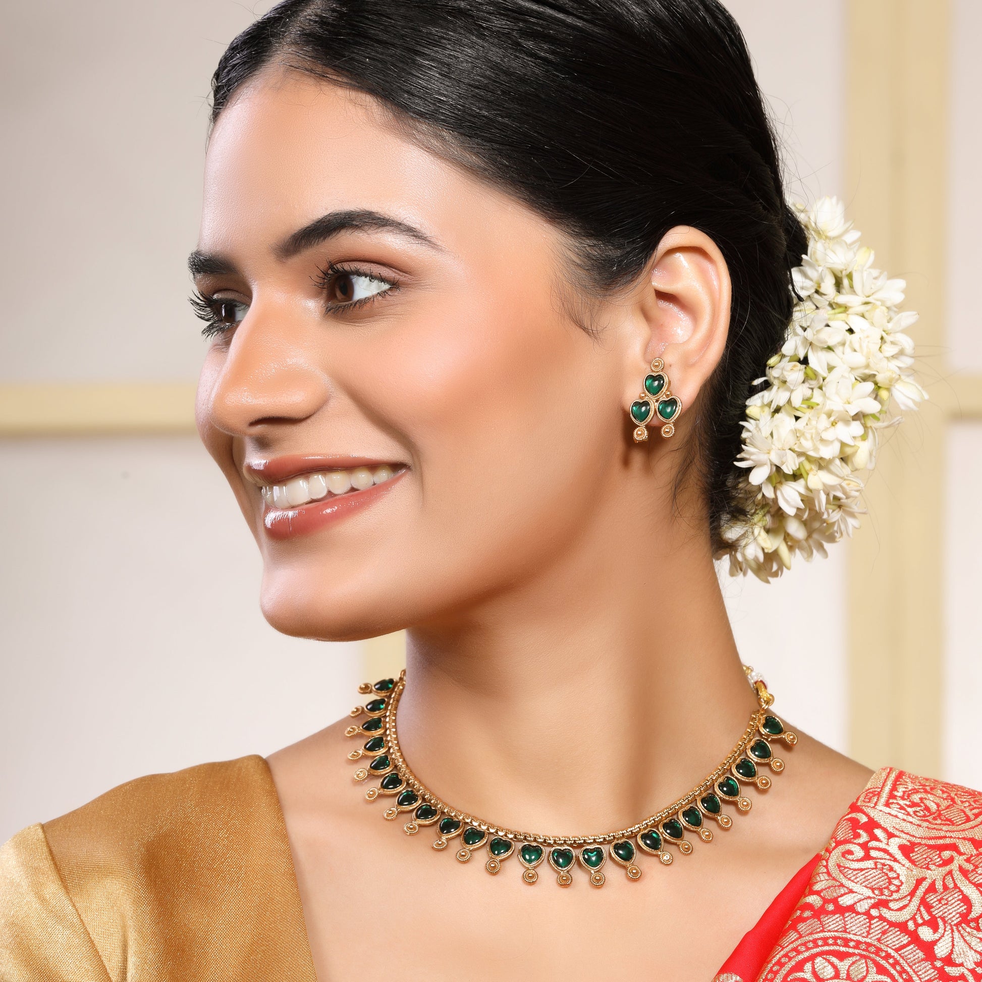 This antique heart-shaped necklace set, adorned with green Kemp stones and a beaded matte gold finish, exudes elegance. Paired with stud earrings, it’s perfect for special occasions.