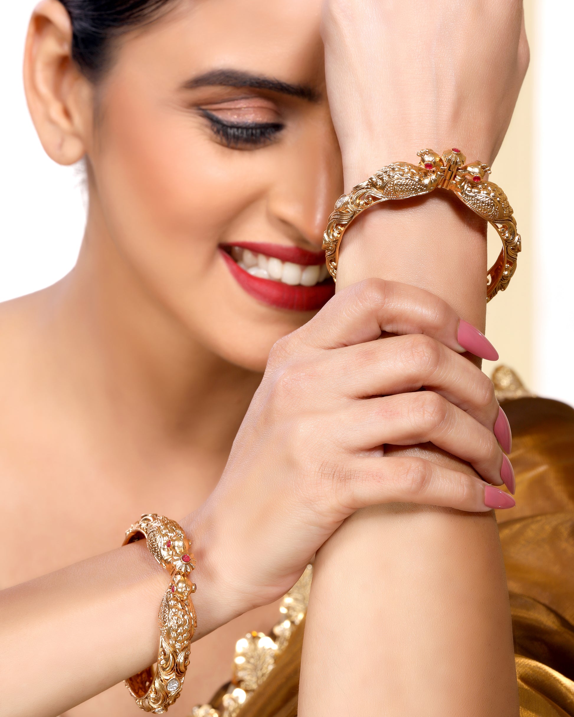 This magnificent bangle is a timeless adornment that expertly combines tradition with culture. Made of brass with a matte gold finish, it features stunning rubies and emeralds that add a touch of opulence to any outfit. Perfect for wearing with sarees or lehengas, this bangle exudes class and style with its bold design and expert craftsmanship. Elevate your accessories collection with this openable kada bangle.