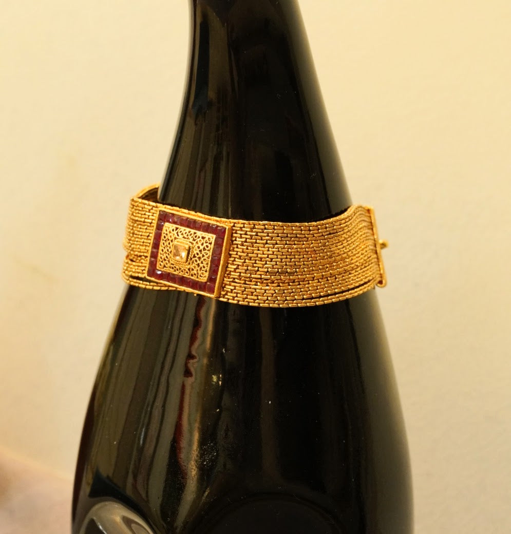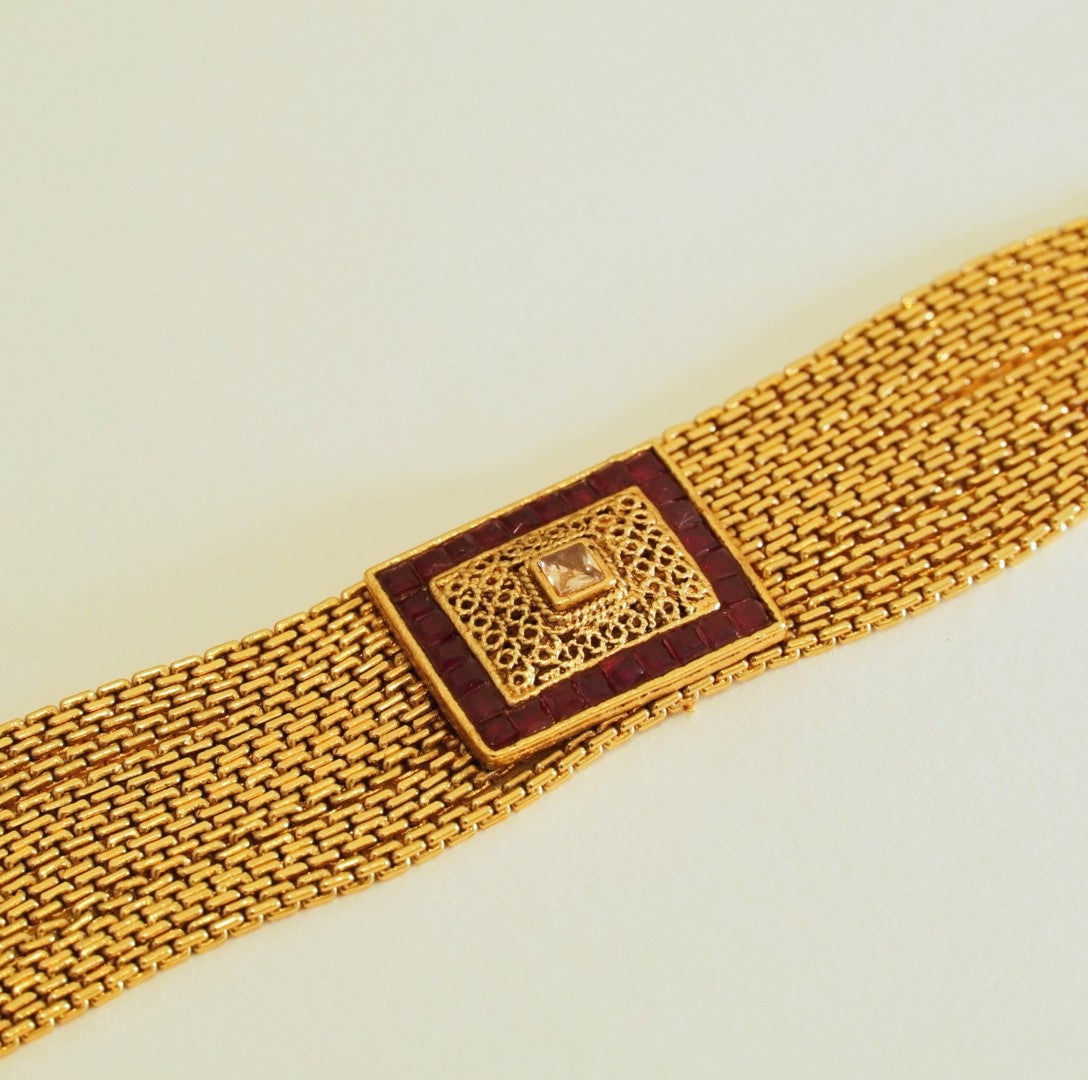 Make a bold statement with our Multilayered Broad Chain Bracelet. Featuring a ruby-studded centerpiece and plated in high gold, this piece combines modern elegance with traditional craftsmanship. Its striking design adds sophistication to any outfit.
